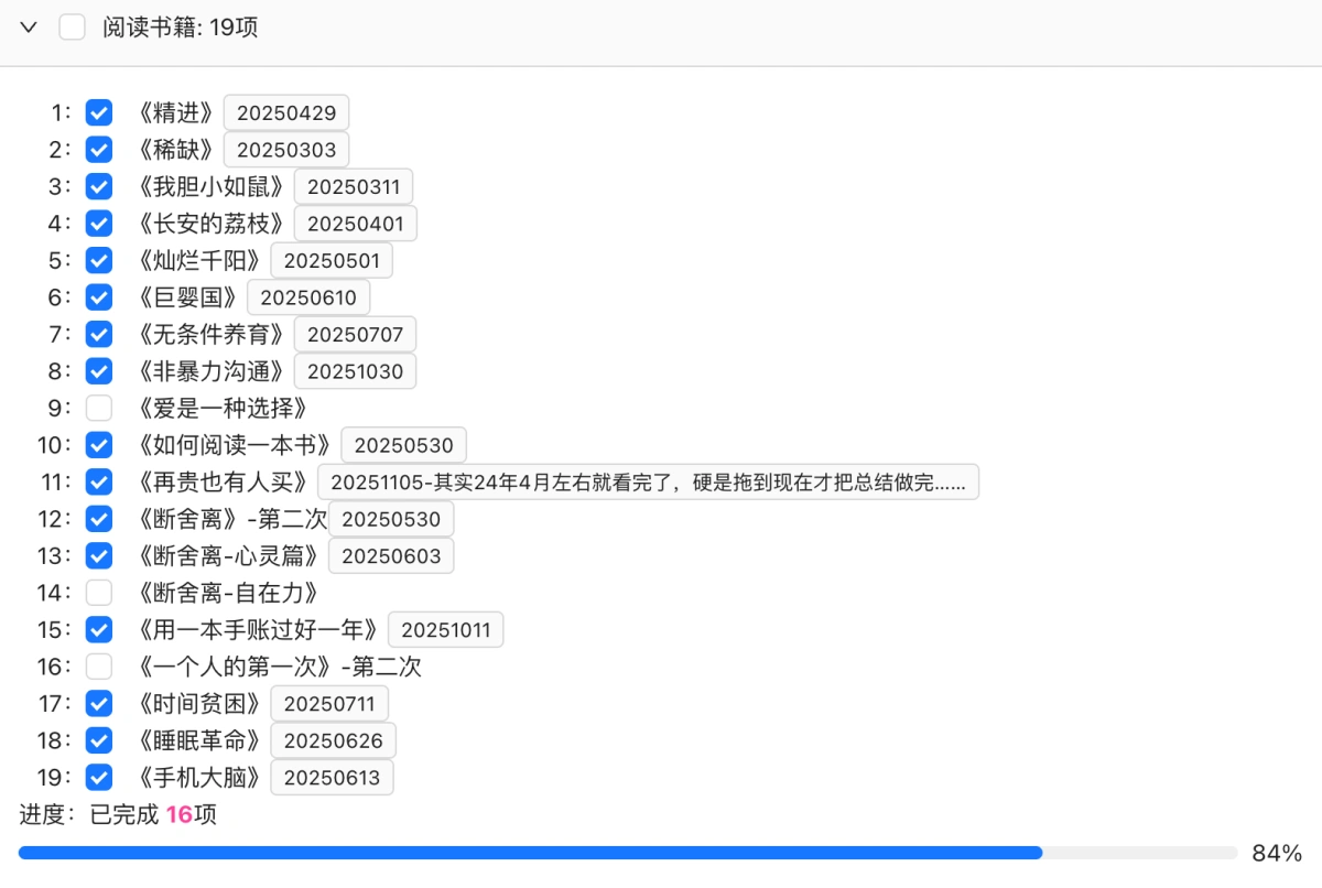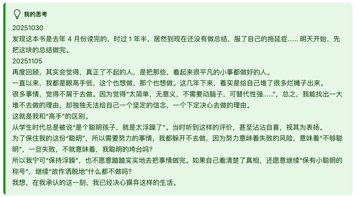 我不知道所谓的【真正的改变】何时到来,但是趁着自己有分享欲的时候,就多去实践吧! 去把自己那些未尽的待办一项项消除! 告诉自己,不要嫌弃一点点微小的进步,哪怕是 1%的改变。 今天和昨天不一样,或是进步,或是退步,对我的影响从长期来看,都是巨大的。 要明白【结果是习惯滞后的指标】。 也许是还未适应当下的状态,每天能做的事情少的可怜。但也算是在慢慢往前推进。